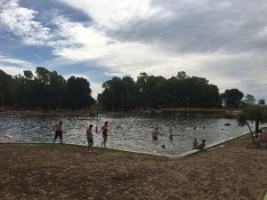 Emprendí una visita al Balneario Municipal de Azul, un ícono de la ciudad, donde los habitantes pasan un verano más acogedor. Es un inmenso predio que incluye un camping y sectores para realizar deportes. Fue una excelente elección, ya que la temperatura de ese día era sofocante. Aproveché para hacer una zambullida y “bañarme” con una canilla publica y me dí una buena refrescada.