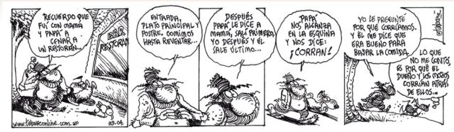 Mi primer perro se llamó Diógenes. Raza canina, seguro. Puedo jurar que por entonces no sabía del antecedente de ese nombre, que refiere a un Filósofo historiador griego de apellido Laercio. Cuando elegí llamarlo así, tomé en cuenta a unos dibujos muy filosóficos (justamente) que aparecían en la última página de un diario, donde se leían interesantes diálogos entre un Linyera y su perro llamado Diógenes. Su autor es un uruguayo llamado Tabaré. Y pueden encontrar muy bello material en su web (que figura debajo del primer cuadro de los dibujos)