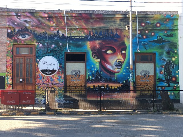 Intenté visitar el Centro Municipal de Cultura, pero no estaba abierto hasta la noche. Seguí mi recorrido, disfrutando de la tranquilidad de la que hablamos. Conversé con algunas personas sobre cuestiones efímeras y observé mucho. De los paisajes urbanos me agradan las puertas desde siempre y los murales callejeros desde que aparecieron. Tal vez no tenga fotos de monumentos, pero de las otras, seguramente.