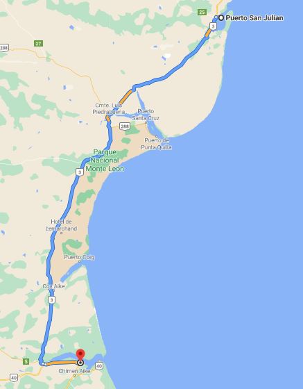 Una gran ventaja en este tramo es que anochece más tarde debido al estío de verano. Finalmente arribé a Río Gallegos cerca de las 9 pm y todavía podía verse con suficiente claridad. La lluvia había mermado y pude instalarme en el playón para camioneros y viajeros. Para acomodar las tensiones de este recorrido, me instalé en la cafetería respirando un aroma a café que aún recuerdo. Era como respirar vida. Expandí sobre la mesa el mapa para explorar cómo realizar el último tramo de 128 km que me separaban de Cabo Vírgenes, bien al sur de esta provincia de Santa Cruz, lugar donde inicia la RN40.