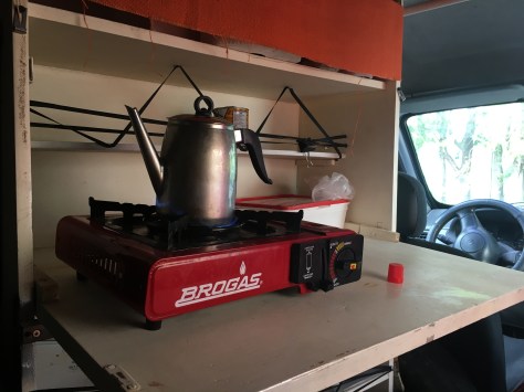 Temprano, a las 7 am ya estaba preparando mi desayuno y carga del termo para el próximo trayecto de exactamente 128 kilómetros. Las condiciones del clima en la región por esos días eran feas. Nubes, probabilidades de chaparrones y mucho, pero mucho viento. Los mapas que uno encuentra en internet no son mejores que los que pueden dibujarte con sus palabras los habitantes del lugar. Recibí un par de recomendaciones de tres camioneros para este tramo. La primera se refería a andar despacio. Los carteles indican un velocidad máxima de 50 kms en algunos sectores y en otros de 20 kms. Pero dado que mi kangumóvil no tiene tracción trasera, si podía circular a menor velocidad, mejor. La segunda, que tuviera en cuenta que no hay señal de internet, ni de teléfono. Esto quería decir, que ante algún imprevisto, debería esperar a que algún transportista o automóvil pasará para pedir auxilio. La espera para ser ayudado podría llegar a ser de hasta un día dentro del trayecto de la RP1, ya que depende de un escaso tránsito. Pocos habitantes de la zona suelen hacer un ida y vuelta, y transitan algunos camiones con cargas de combustibles (lo que genera grandes pozos en el camino).de