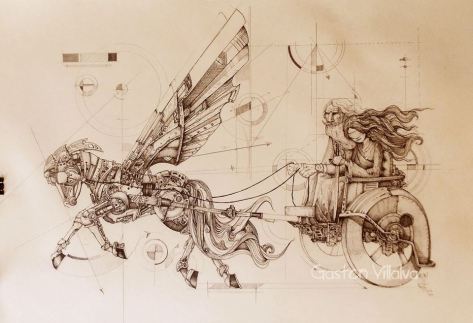 Al otro día Pedro era otro. Parecía un muñeco de torta de casamiento sentado en la misma mesa de siempre pero con modales recatados, sobrios y calculados. Si hasta el mozo que lo atendía todos los días se sorprendió y le preguntó “¿se ha ganado la lotería?”. Para aprovechar cada posibilidad de hacer su propia propaganda le respondió “No diga nada, pero estoy tras un invento maravilloso”. Y de adentro de su maletín sacó una carpeta y solo mostró la fotocopia de un dibujo que se robó de una página llamada Duende a lápiz… de un dibujante excepcional llamado Gastón Villalba. La obra se llamaba “El tiempo trayendo a la Justicia”. Y mostraba sobre un fondo Davincesco un caballo alado y mecánico impulsando hacia adelante a un carro de dos ruedas que transporta a dos personas, una de ellas tiene los ojos vendados. De esto se trata, pero no lo cuentes, por favor, le dijo al mozo, casi susurrando. El camarero miró el dibujo como quien mira una receta escrita en ruso y le dijo “quédese tranquilo, yo no le contaré a nadie”.